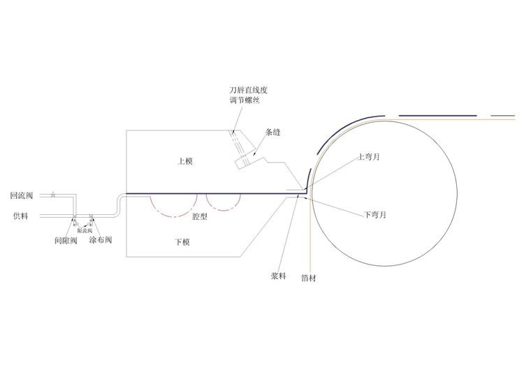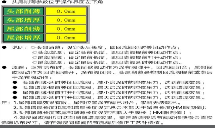 此種情況是因為未能及時將間隙留白處的漿料回流,所以模頭噴咀唇口料會外溢再啟涂時腔體壓力瞬間釋放造成頭第點偏厚。