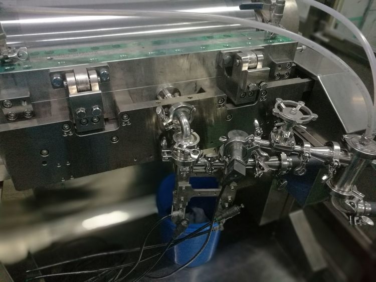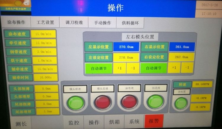 涂布模頭,如上圖所示,箔材經(jīng)過驅動背輥與擠壓頭之間的間隙繞過背輥向一個方向行進,擠壓頭間歇地向泊材涂覆漿料。頭厚,是因為模頭為了克服漿料的靜磨擦而采用的開始漿料瞬時壓力較高而產(chǎn)生的;拖尾,是漿料涂完后,由于漿料的流涎作用,而產(chǎn)生的涂長在收尾時產(chǎn)生的鋸齒狀的邊緣,為了解決厚頭和拖尾的問題,涂布系統(tǒng)控制方法包括以下步驟在模頭開始向泊材涂覆漿料時,擠壓模頭縫口處的漿料進行倒吸使?jié){料回流;依據(jù)該涂布方法,在開始涂布時,使擠壓頭中漿料在開始供料的瞬間微量回流,減少涂覆于基材上的漿料量,可以有效地控制間歇涂布頭部的厚度;而在間歇時即擠壓頭停止涂布時,同樣使擠壓頭中漿料瞬間回流,使涂覆在基體上的漿料可以迅速斷開,這樣有效地控制間歇時尾部拖尾的整齊度。從調試過程中結果來看,這種涂布方法對模頭腔體壓力控制要求非常高,如果控制稍有偏差,不但不能解決頭厚和拖尾的問題,反而還會適得其反。(所以對漿料粘度偏差不能太大)