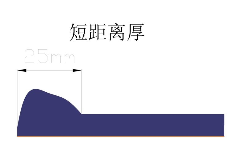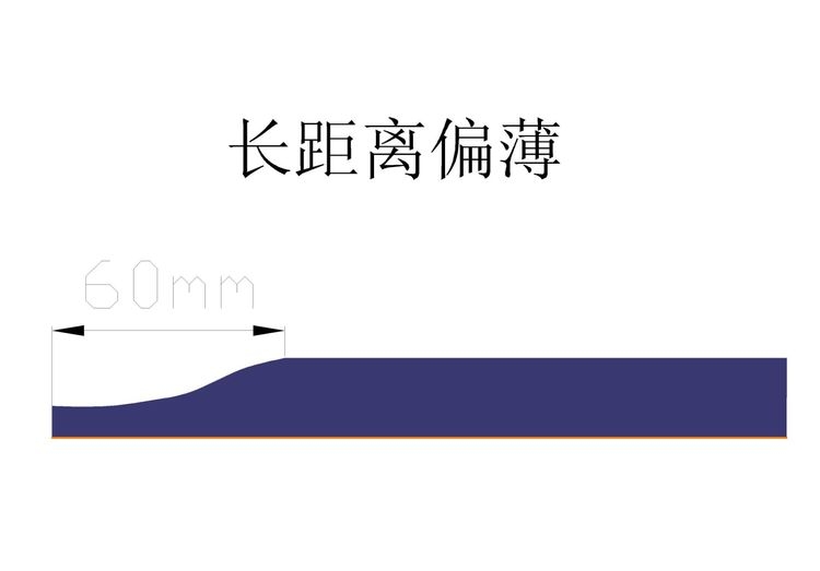 上圖情況是因為留白處的多余的漿料未能快速回流,即馬上要啟涂時多余的漿料在泊材與漿料接觸處會形成一個凸彎月面,彎月的曲率半徑越大,漿料下滴降過大會造成下彎月面不穩(wěn)定就會出現(xiàn)頭第一厚再薄再厚后正常如上圖所示情況。解決方法①更換薄墊片讓唇口彎月弧形變?、诩哟蠡亓鏖y芯內(nèi)徑尺寸讓漿料快速回流③調節(jié)間隙閥氣流增大讓閥打開速度快些。根據(jù)現(xiàn)場實際情況調節(jié)控制腔體壓力,回流壓力及間隙閥氣缸限流閥。