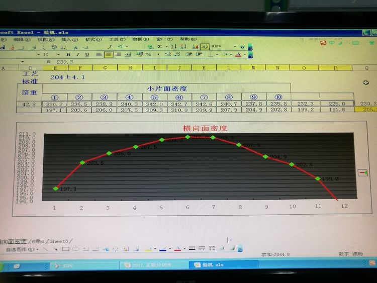 更換上圖墊片厚度為1.0mm后各項工藝要求可控達標,若在停機過長時需要將模頭腔體的漿料噴出更換新料否則會出上圖面密度或不同程度規(guī)則的變化。